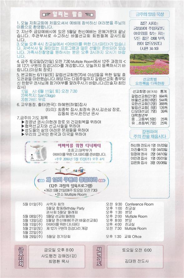금주 토요일(5/21일) 오전 7:30 Multiple Room에서 12주 과정의 <제 12기 구원의 징검다리>를 개강합니다. 오늘까지 등록하시기 바랍니다.(이상희 장로)