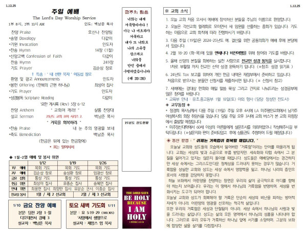 01/12/25 교회 주보 페이지 정보 작성자 아름다운동산교회 댓글 0건 조회 1,491회 작성일 25-01-11 08:12 목록 본문 01/12/25 이전글01/19/25 교회 주보 25.01.18 다음글01/05/25 교회 주보 25.01.04 댓글 0 댓글목록 등록된 댓글이 없습니다. 목록