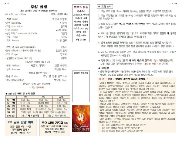 02/02/25 교회 주보 페이지 정보 작성자 아름다운동산교회 댓글 0건 조회 1,266회 작성일 25-02-01 07:53 목록 본문 02/02/25 이전글02/09/25 교회 주보 25.02.08 다음글01/26/25 교회 주보 25.01.25 댓글 0 댓글목록 등록된 댓글이 없습니다. 목록