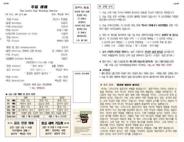 02/09/25 교회 주보 페이지 정보 작성자 아름다운동산교회 댓글 0건 조회 1,501회 작성일 25-02-08 08:01 목록 본문 02/09/25 이전글02/16/25 교회 주보 25.02.15 다음글02/02/25 교회 주보 25.02.01 댓글 0 댓글목록 등록된 댓글이 없습니다. 목록