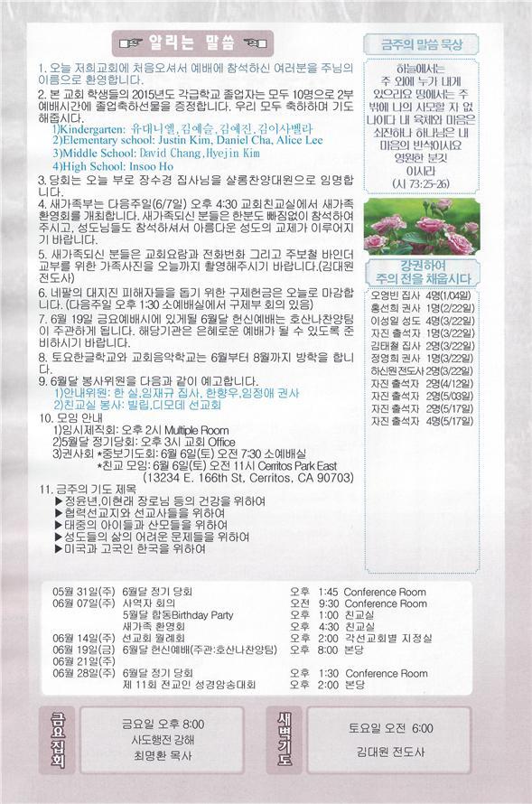 새가족부는 다음주일(6/7일) 오후 4:30 교회친교실에서 새가족 환영회를 개최합니다. 새가족되신 분들은 한분도 빠짐없이 참석하여주시고, 성도님들께서도 참석하셔서 아름다운 성도의 교제가 이루어지기 바랍니다.