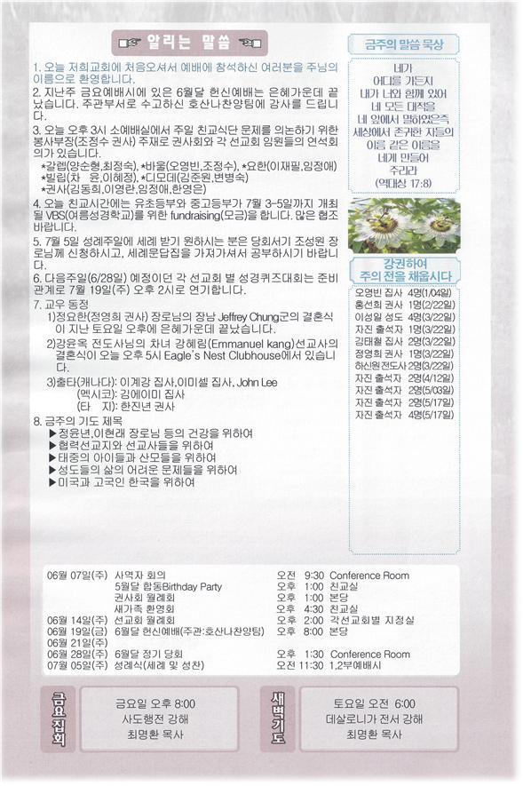 오늘 친교시간에는 유초등부와 중고등부가 7월 3-5일까지 개최될 VBS(여름성경학교)를 위한 fundraising(모금)을 합니다. 많은 협조바랍니다.