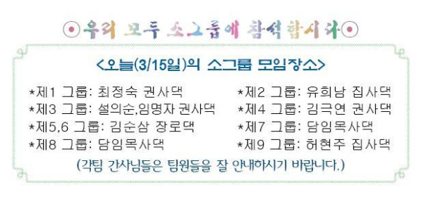 *오늘오후에도 넷째 주 소그룹 모임을 가집니다. 각그룹 간사님들은 모일 시간과 장소의 약도를 팀원들에게 정확히 알려주시기 바랍니다.