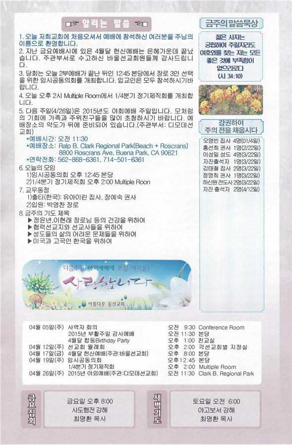 다음 주일(4/26일)은 2015년도 야회예배 주일입니다. 모처럼의 기회에 가족과 주위친구들을 많이 초청하시기 바랍니다. 예배장소의 약도가 뒤에 준비되어 있습니다.(주관부서: 디모데선교회)