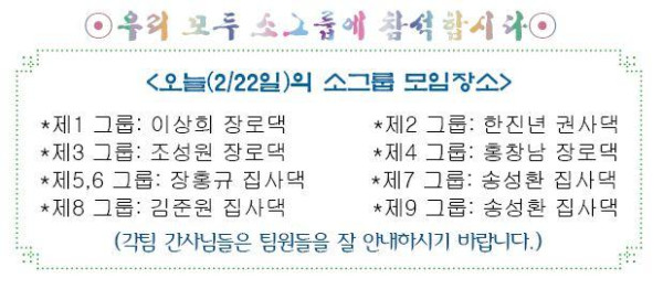 4. 각 그룹별 간사들은 Office에 준비된 소그룹 교재<풍요로운 삶 2>를 가져가셔서 팀원들에게 배부해주시고, 팀원들을 잘 안내하시고, 매주 모임의 결과를 카톡으로 보고해주시기 바랍니다.