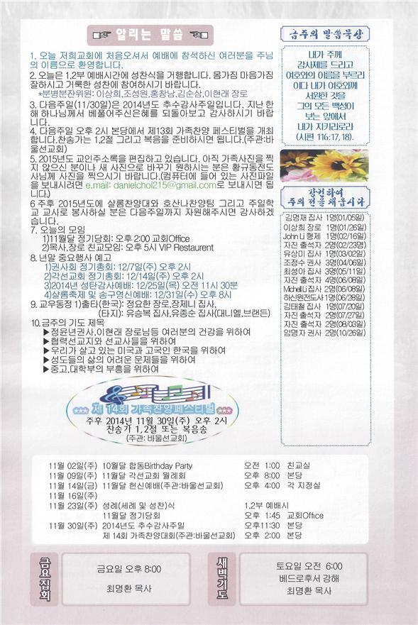 - 다음글11/16/14 주일 교회 소식 14.11.15