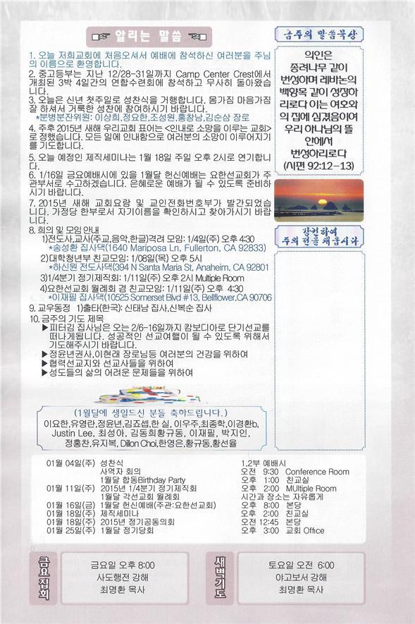 1/16일 금요예배시에 있을 1월달 헌신예배는 요한선교회가 주관부서로 수고하겠습니다. 은혜로운 예배가 될 수 있도록 준비하시기 바랍니다.