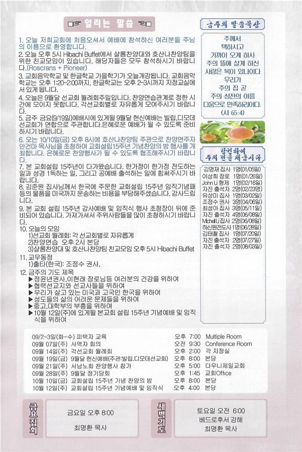 오는 10/10일(금) 오후 8시에 호산나찬양팀 주관으로 찬양연주자 안건마 목사님을 초청하여 교회설립15주년 기념찬양의 밤 행사를 개최합니다. 은혜로운 찬양행사가 될 수 있도록 협조해주시기 바랍니다.