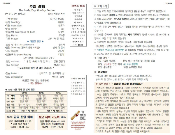 12/08/24 교회 주보 페이지 정보 작성자 아름다운동산교회 댓글 0건 조회 2,135회 작성일 24-12-07 08:35 목록 본문 12/08/24 이전글12/15/24 교회 주보 24.12.14 다음글12/01/24 교회 주보 24.11.30 댓글 0 댓글목록 등록된 댓글이 없습니다. 목록