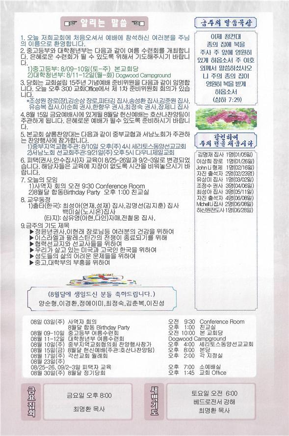 1)중고등부: 8/09-10일(토-주)  본교회당