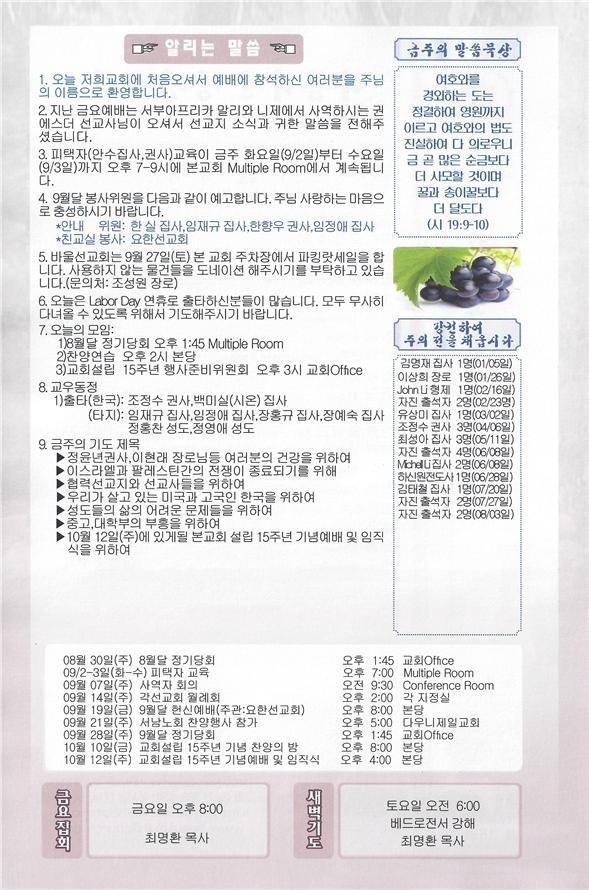 피택자(안수집사,권사)교육이 금주 화요일(9/2일)부터 수요일(9/3일)까지 오후 7-9시에 본교회 Multiple Room에서 계속됩니다.