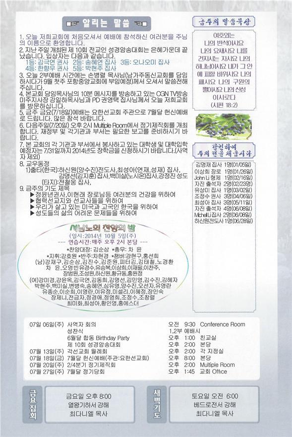 본 교회의 각 기관과 부서에서 봉사하고 있는 대학생 및 대학입학예정자는 7/31일까지 2014년도 장학금을 신청하시기 바랍니다.(사역자 제외)