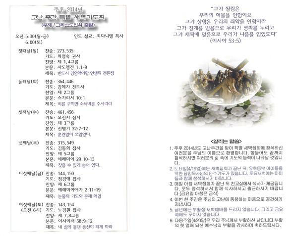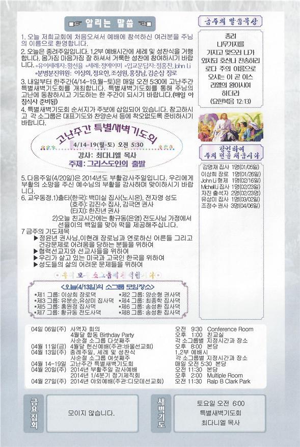 04/13/14 주일 교회소식 및 고난주간 특새 순서지 > 교회주보