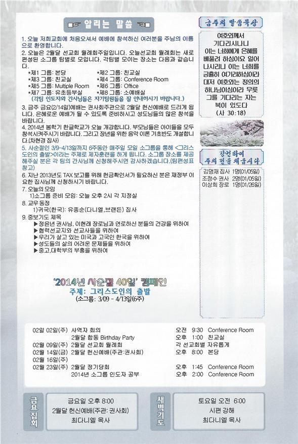 *2014년 봄학기 한글학교가 오늘 개강됩니다. 부모님들은 아이들을 모두 참석시켜주시기 바랍니다. 그리고 장년을 위한 음악 이론 기초반도 개설합니다.(차현경 집사)