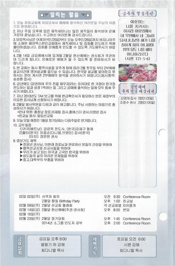 *본 교회는 동시 통역시설을 갖추게 됨에 따라 2월 첫주일 부터 2부예배 설교시간에 영어설교를 들으실 수 있습니다. 한국말 설교를 알아듣지 못하시는 분이 계시면 2부예배의 참석을 권유하시기 바랍니다.(동시통역: 송성환 집사)