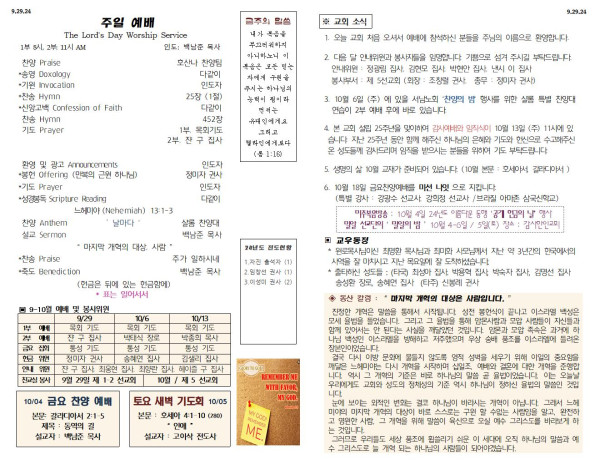 09/29/24 교회 주보 페이지 정보 작성자 아름다운동산교회 댓글 0건 조회 2,202회 작성일 24-09-28 07:00 목록 본문 09/29/24 이전글10/06/24 교회 주보 24.10.05 다음글09/22/24 교회 주보 24.09.21 댓글 0 댓글목록 등록된 댓글이 없습니다. 목록