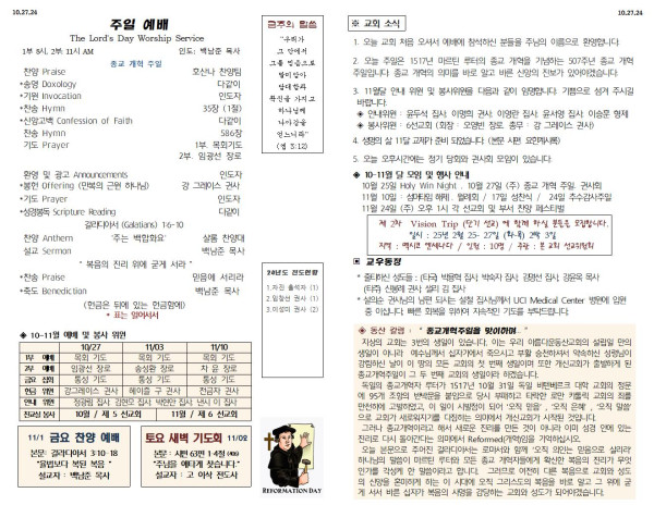 10/27/24 교회 주보 페이지 정보 작성자 아름다운동산교회 댓글 0건 조회 2,316회 작성일 24-10-26 06:57 목록 본문 10/27/24 이전글11/03/24 교회 주보 24.11.02 다음글10/06/24 교회 주보 24.10.05 댓글 0 댓글목록 등록된 댓글이 없습니다. 목록