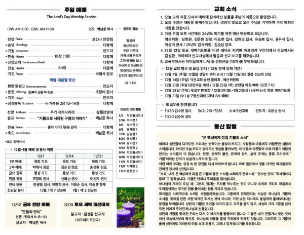 12/07/25 교회 주보 페이지 정보 작성자 아름다운동산교회 댓글 0건 조회 109회 작성일 25-12-06 08:27 목록 본문 12/07/25 이전글12/14/25 교회 주보 25.12.13 다음글11/23/25 교회 주보 25.12.06 댓글 0 댓글목록 등록된 댓글이 없습니다. 목록