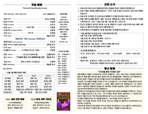 12/14/25 교회 주보 페이지 정보 작성자 아름다운동산교회 댓글 0건 조회 30회 작성일 25-12-13 10:59 목록 본문 12/14/25 다음글12/07/25 교회 주보 25.12.06 댓글 0 댓글목록 등록된 댓글이 없습니다. 목록